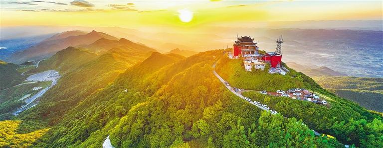 7月26日,周边民众驾车来到四川省华蓥市华蓥山高登古刹,一边避暑纳凉,一边欣赏夕阳、晚霞,感受大自然的雄浑壮美。