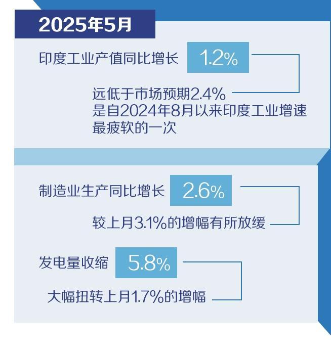 根据公开数据显示,2025年5月印度工业产值较上年同期增长1.2%,增速低于上月向下修正的2.6%,且远低于市场预期的2.4%,这是自2024年8月以来印度工业增速最疲软的一次。制造业生产同比增长2.6%,较上月3.1%的增幅有所放缓,而发电量则收缩5.8%,大幅扭转了上月1.7%的增幅。此外,矿业产出收缩0.1%,延续了4月份0.2%的降幅。