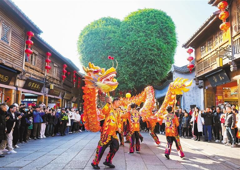 1月29日拍摄的福建省福州市鼓楼区三坊七巷历史文化街区舞龙表演。当地“修旧如旧”模式更好地保护与传承了城市历史文脉。谢贵明摄