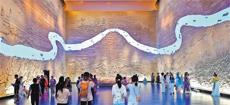 7月18日,游客在河南省洛阳市隋唐大运河文化博物馆游览。该馆采用开放式设计,与城市环境相融,营造出独特的参观体验。