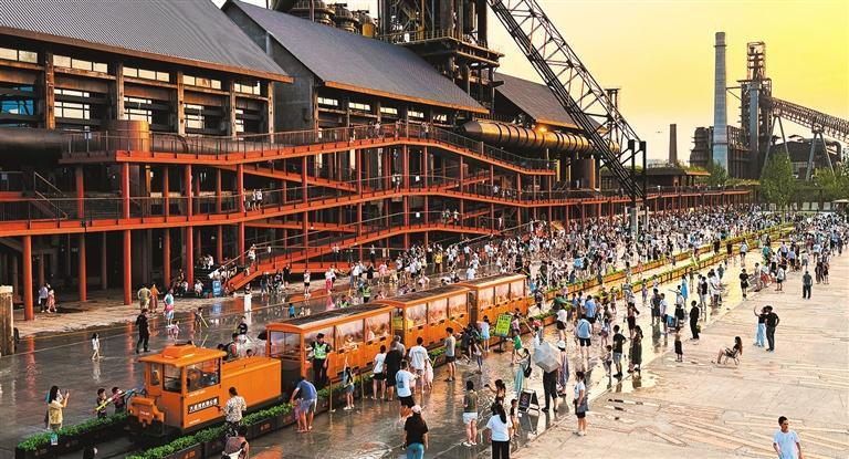 7月13日,市民在浙江省杭州市杭钢公园休闲游玩。当地通过改造工业遗存,打造城市工业文化保护利用新地标。