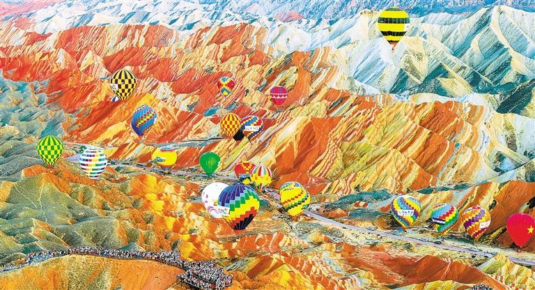 7月31日,第五届张掖七彩丹霞热气球嘉年华活动中,来自全国各地的40名运动员驾乘热气球,飞越七彩丹霞景区,色彩艳丽的热气球与七彩丹霞相互映衬,吸引游客前来观赏。杨 潇摄(中经视觉)