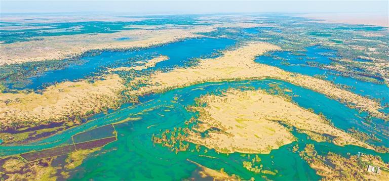 近年来,随着塔里木河流域综合治理不断推进,流域内的罗布淖尔国家湿地公园环境不断改善。图为新疆巴音郭楞蒙古自治州尉犁县罗布淖尔国家湿地公园,沙漠、河流、胡杨等相映成辉。