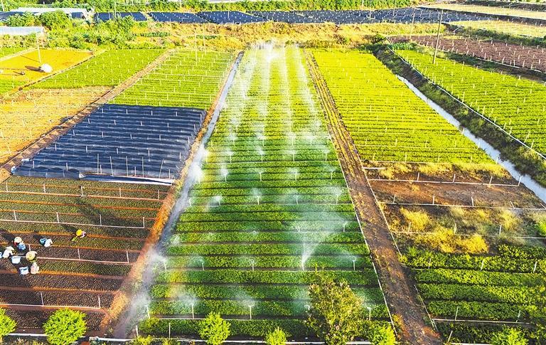 8月12日,湖南省永州市冷水滩区伊塘镇原宏园林绿化有限公司苗木基地,自动化喷灌设备正在作业。近年来,当地大力推广滴灌、喷灌等智能灌溉技术,根据苗木需水情况科学种植、可控化管理,推动苗木产业节水降本、增收增效。雷中祥摄(中经视觉)