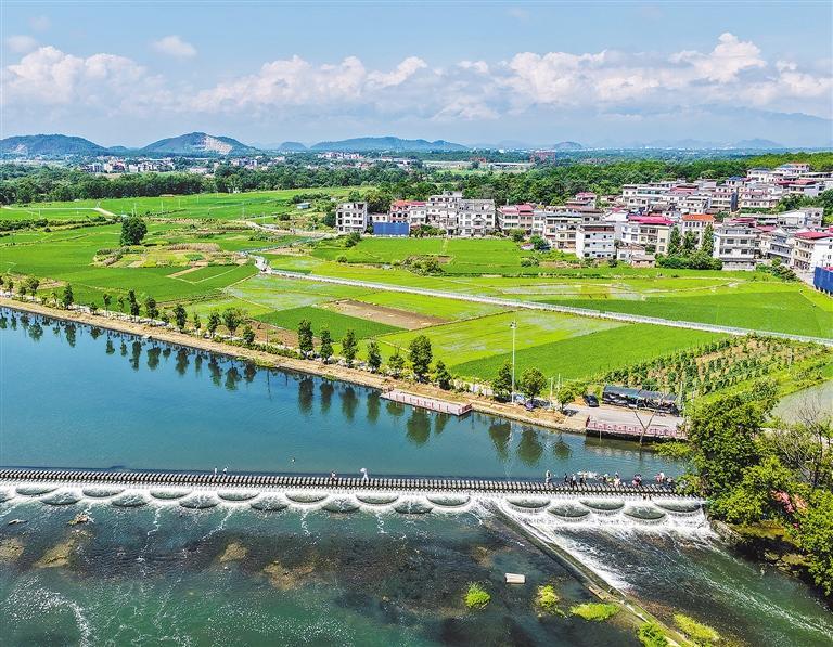 近日,游客在湖南省永州市道县梅花镇贵头村的叠水汀步桥上游玩。近年来,当地以“生态+旅游”融合发展,有效激活田园山水观光经济。