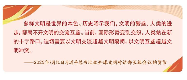 在人类漫长的历史进程中,各民族创造了各具特点和标识的文明。各种文明相互遇见、交流互鉴、彼此成就,书写了和而不同、和合共生、美美与共的人类文明篇章。习近平文化思想以宽广的历史视野,深刻把握人类文明历史发展的主流本质,深入洞察当今世界文明演进态势,深刻回答人类文明向何处去的文明之问,以一系列原创性理念和学理性阐释,深化了对人类文明发展的规律性认识,拓展了文明论的视野。