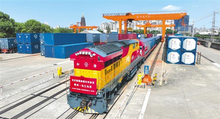 8月23日,一辆满载光伏板的集装箱货运专列从江苏常州站出发,开往新疆乌兰乌苏站。这是该站发出的首个光伏板集装箱专列,将为西部地区光伏新能源规模化供应提供高效、安全的物流保障。陈 暐摄(中经视觉)