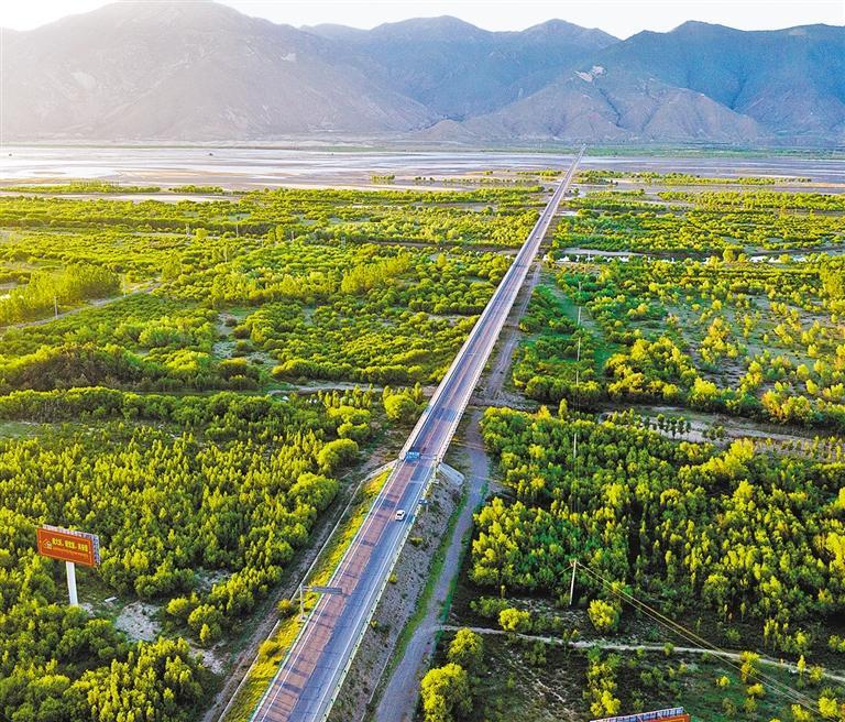 7月8日拍摄的山南市扎囊大桥,两旁的沙荒地上绿意盎然。山南市大力开展生态文明高地创建工作,通过植树造林打造生态绿廊,群众的生活环境得到极大改善。次仁龙布摄(中经视觉)