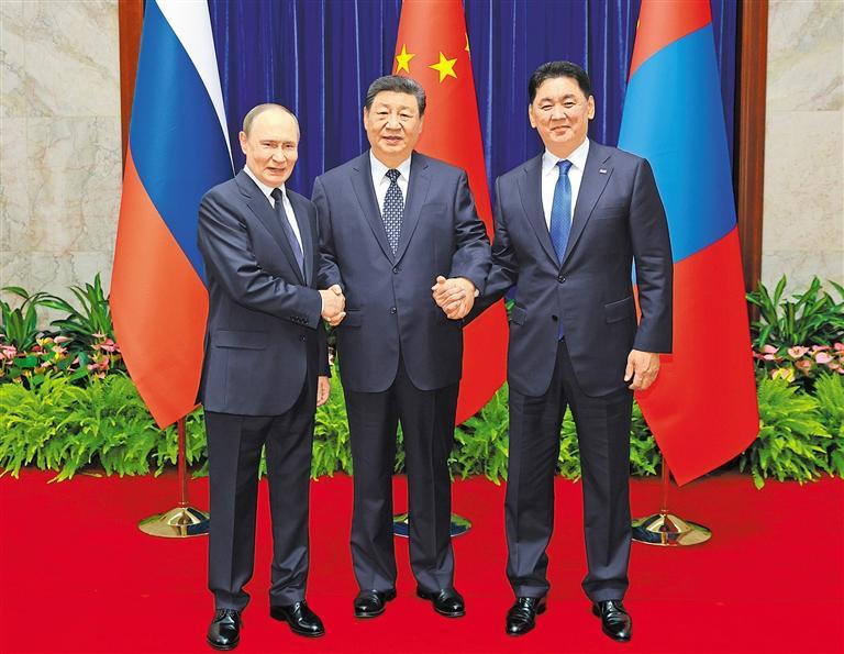 习近平指出,近年来,中俄蒙三方合作稳步发展,取得实实在在的成果。三方合作中期路线图顺利实施,三国贸易额节节攀升,经贸、科技、生态保护、人文合作不断深化。作为山水相连、休戚与共的友好邻邦,中方愿同俄方、蒙方一道,坚守合作初心,排除外部干扰,携手推动三方合作高质量发展。