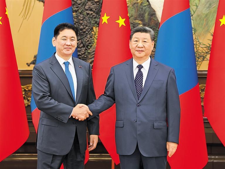习近平指出,中蒙是山水相连的友好邻邦,两国各领域交流合作不断深化,多个重点项目取得积极进展。双方要以中蒙命运共同体建设为引领,巩固战略互信,深化发展融合,促进民心相通,不断为两国全面战略伙伴关系注入前进动力。