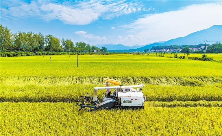 白露节气将至,湖北多地中稻陆续成熟进入收获季。在黄冈市英山县金家铺镇扁石畈村农田,当地农民抢抓农时收割稻谷,确保丰产丰收。王 江摄(中经视觉)