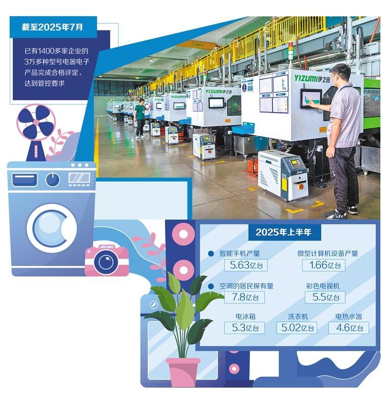 电器电子产品量大面广,与人民群众生产生活密切相关,是典型的群众身边的事。我国是全球最大的电器电子产品生产国和消费国。2025年上半年,我国智能手机产量5.63亿台,微型计算机设备产量1.66亿台。同时,空调的居民保有量7.8亿台、彩色电视机5.5亿台、电冰箱5.3亿台、洗衣机5.02亿台、电热水器4.6亿台。