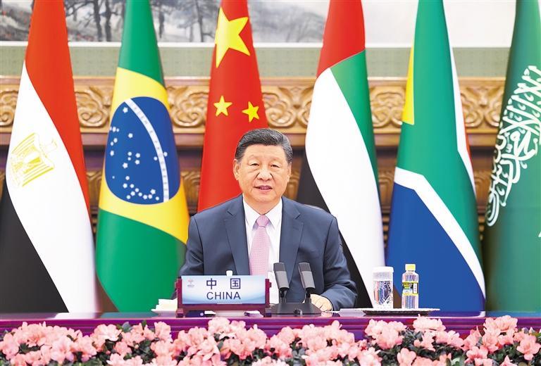 习近平指出,当前,世界百年变局加速演进,霸权主义、单边主义、保护主义甚嚣尘上。金砖国家作为全球南方第一方阵,要坚持弘扬开放包容、合作共赢的金砖精神,共同捍卫多边主义,维护多边贸易体制,推进“大金砖合作”,携手构建人类命运共同体。