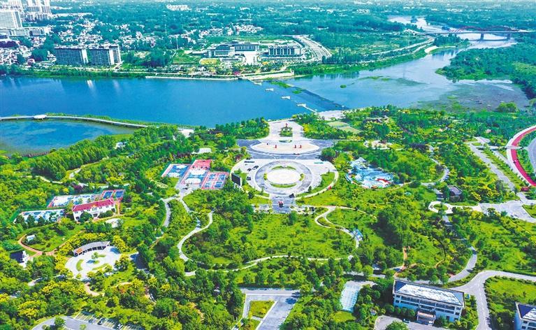 9月7日拍摄的河南省信阳市光山县官渡河盛湾公园。近年来,光山县坚持走绿色发展之路,强化生态保护长效机制建设,在官渡河沿岸建成8座集休闲、健身、娱乐、观赏等多种功能于一体的城市公园。谢万柏摄(中经视觉)