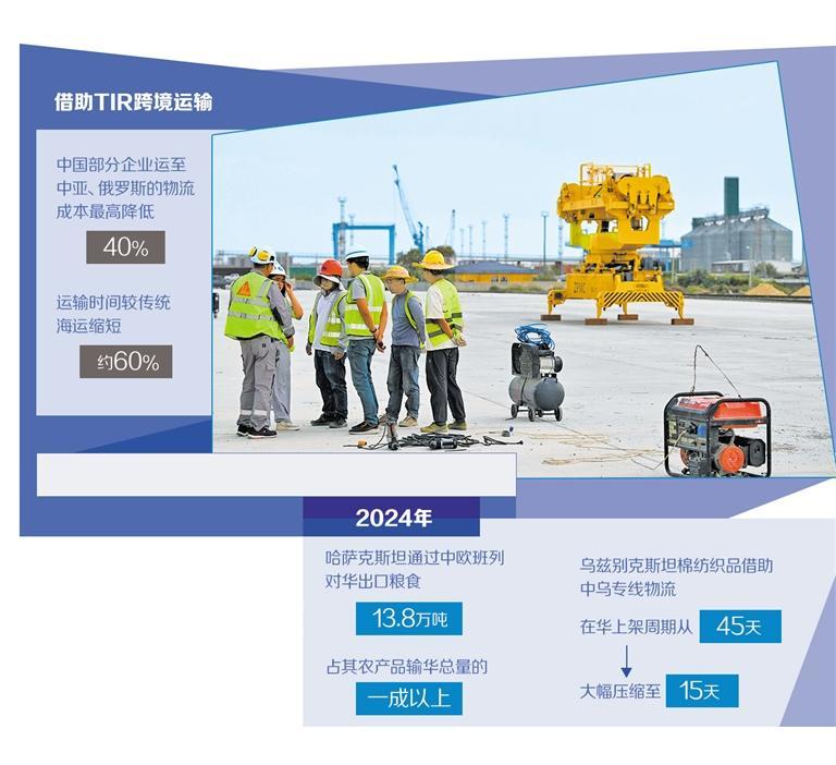 在区域产业链协同方面,TIR运输也为企业与成员国带来了实实在在的收益:中国部分企业借助TIR跨境运输,将运至中亚、俄罗斯的物流成本最高降低40%,运输时间较传统海运缩短约60%;2024年,哈萨克斯坦通过中欧班列对华出口粮食13.8万吨,占其农产品输华总量的一成以上;乌兹别克斯坦的棉纺织品借助中乌专线物流,在华上架周期从45天大幅压缩至15天。在产业链协同层面,汽车零部件、电子元件等中间品成了跨境电商新增长点,标志着区域合作正从商品贸易向产业链深度融合升级,通过降成本、提效率、拓品类,实现了上下游产业链的互利共赢。
