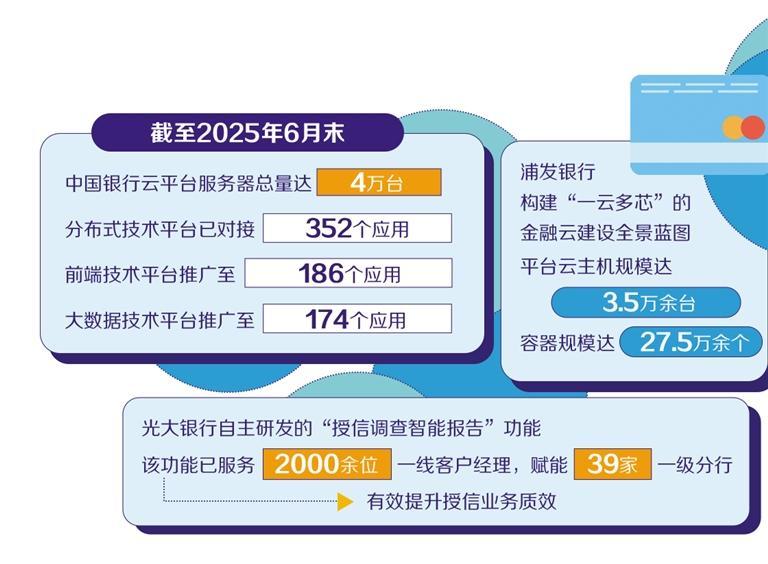 国有大型银行在数字技术应用方面保持前列。记者从中国银行获悉,该行数字化转型步伐加力提速,通过深化人工智能等新技术应用,强化交易集约、提升服务效能,培育分行数字化转型新成果,形成推广一批、储备一批的良性循环。通过持续推进技术架构转型,该行云平台服务器总量达4万台,截至2025年6月末,分布式技术平台已对接352个应用,前端技术平台推广至186个应用,大数据技术平台推广至174个应用。