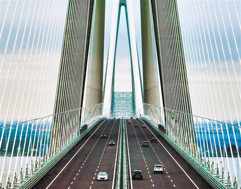 9月9日,车辆在常泰长江大桥上行驶。该桥于当日正式通车,是世界最大跨度斜拉桥,连接江苏省常州与泰州两市。