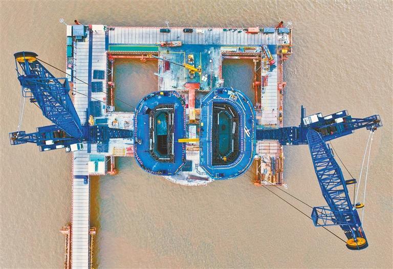 9月10日在浙江省舟山市定海区拍摄的甬舟铁路西堠门公铁两用大桥4号主塔施工现场。