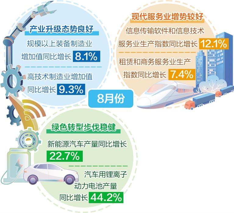 国家统计局发布的数据显示,8月份,宏观政策协同发力,国民经济运行总体平稳,转型升级稳步推进,高质量发展取得新成效。