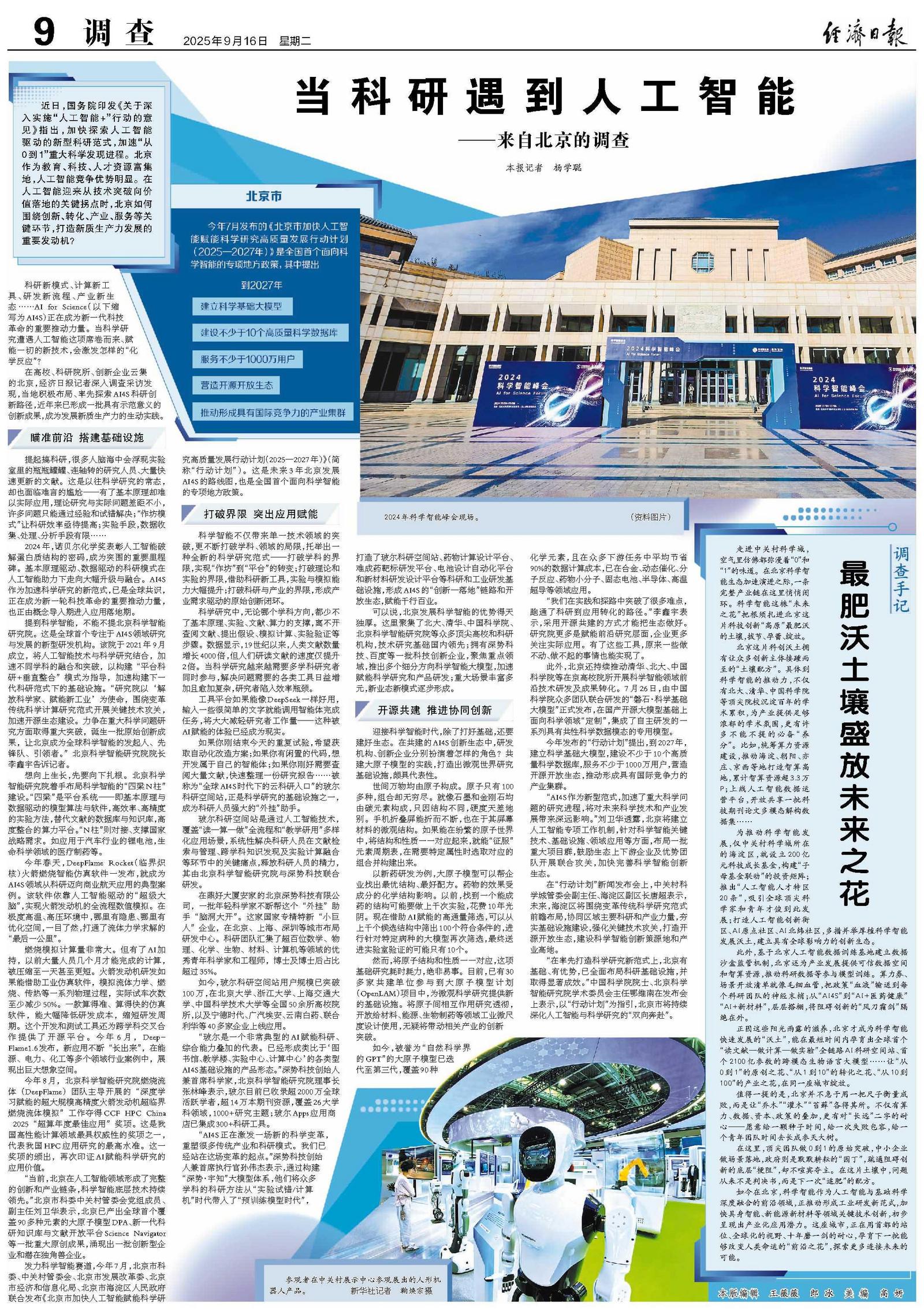 在高校、科研院所、创新企业云集的北京,经济日报记者深入调查采访发现,当地积极布局、率先探索AI4S科研创新路径,近年来已形成一批具有示范意义的创新成果,成为发展新质生产力的生动实践。