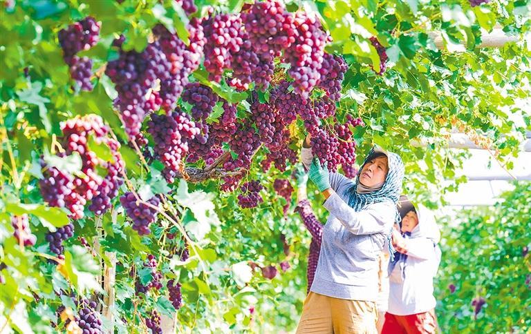 近日,新疆昌吉回族自治州昌吉市大西渠镇玉堂村葡萄种植园,村民在采摘葡萄。近年来,当地通过打造标准化示范点、培育产业带头人等措施,推动葡萄种植规模化、品牌化发展。 何 龙摄(中经视觉)