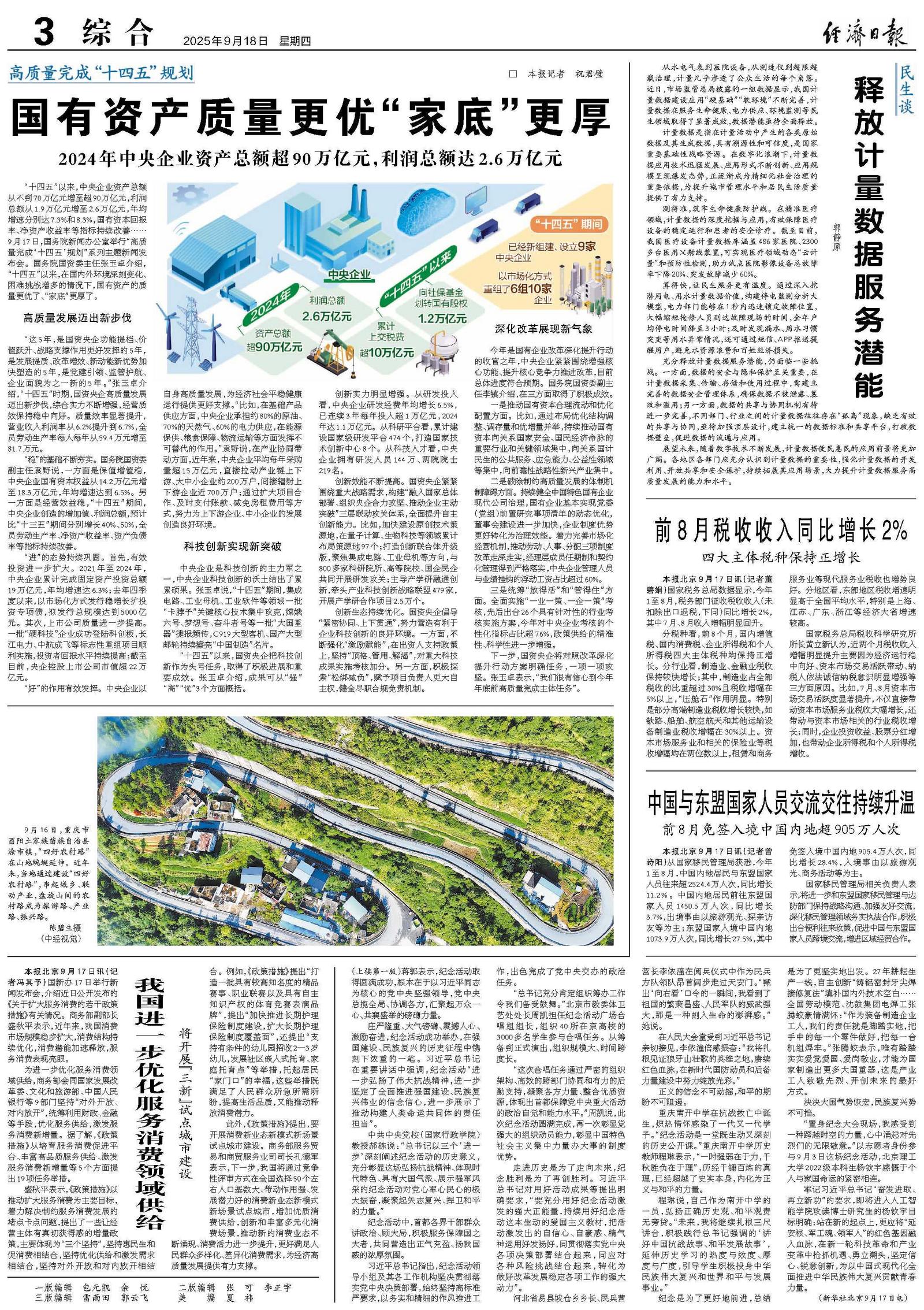分税种看,前8个月,国内增值税、国内消费税、企业所得税和个人所得税四大主体税种均保持正增长。分行业看,制造业、金融业税收保持较快增长;其中,制造业占全部税收的比重超过30%且税收增幅在5%以上,“压舱石”作用明显。特别是部分高端制造业税收增长较快,如铁路、船舶、航空航天和其他运输设备制造业税收增幅在30%以上。资本市场服务业和相关的保险业等税收增幅均在两位数以上,租赁和商务服务业等现代服务业税收也增势良好。分地区看,东部地区税收增速明显高于全国平均水平,特别是上海、江苏、广东、浙江等经济大省增速较高。