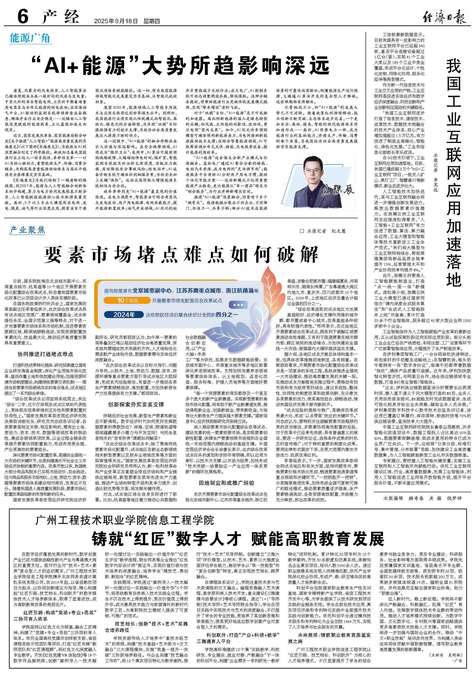 人工智能技术加快迭代,其与工业互联网融合将进一步增强创新发展动力,释放出数据要素价值潜力。在浪潮云洲工业互联网总经理庞松涛看来,“人工智能+工业互联网”有力促进了数据、算法、算力融合应用,工业大模型和智能体等技术重新定义工业生产范式。“我们将大模型与工业互联网相结合,帮助黑猫集团将新品品质合格率提升15%,经营管理水平和产业协同效率均提升8%。”