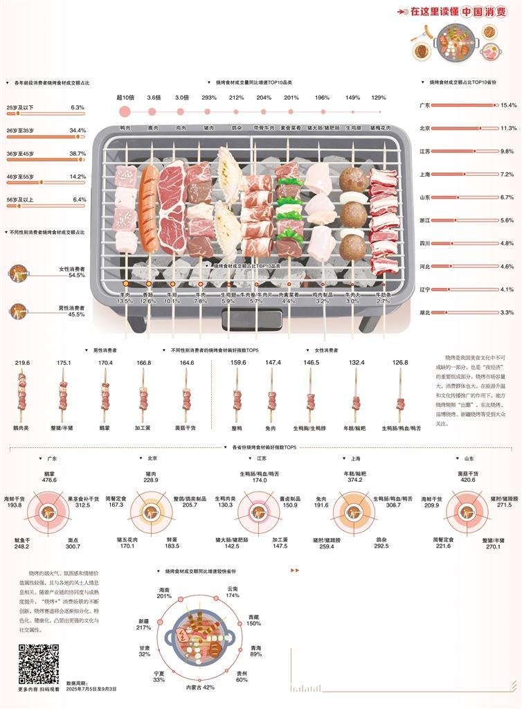对烧烤的喜爱不分南北东西,但不同地域对烧烤食材的偏好有所差别。从各地烧烤食材偏好度看,南方地区消费者偏好禽类食材。其中,广东消费者偏好鹅类,特别是鹅掌;江苏和上海的消费者喜爱鸭肠、鸭血、鸭舌等鸭类产品。北方地区消费者整体偏好畜类食材。例如,在北京和山东消费者偏好的五大烧烤食材中,都可以看到猪肉产品。