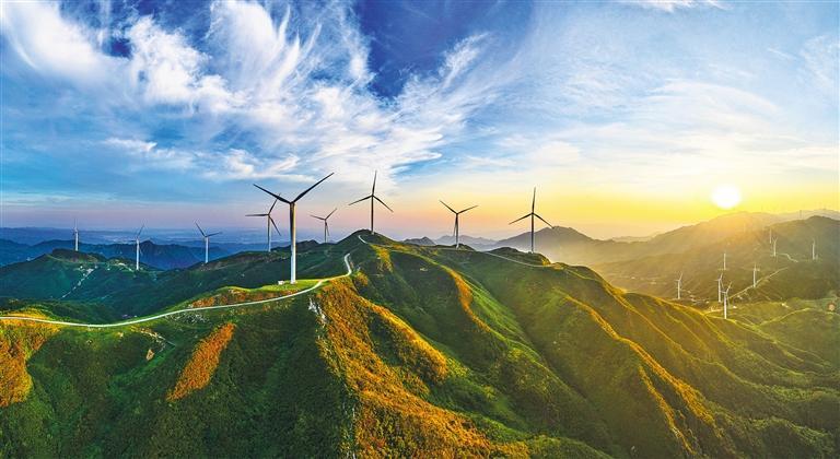 日前,湖南省郴州市桂阳县天堂山,风力发电机组擎天矗立,在绚丽朝霞的映衬下,壮美如画。近年来,当地深入践行生态优先、绿色发展理念,大力发展风电产业,推动绿色清洁能源建设,形成了集风力发电、观光旅游、环保示范于一体的风电长廊,助推县域经济社会高质量发展。