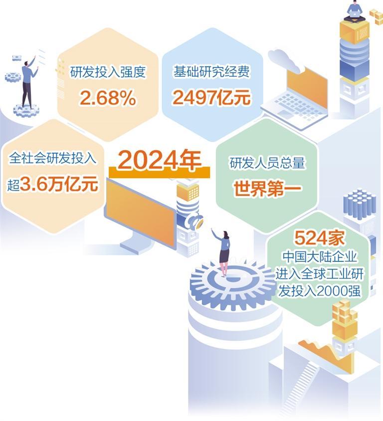 科技投入持续增加。2024年全社会研发投入超3.6万亿元,较2020年增长48%;研发投入强度达2.68%,超过欧盟国家平均水平;研发人员总量世界第一。基础研究经费达2497亿元,较2020年增长超过70%,在量子科技、生命科学、物质科学、空间科学等领域取得一批重大原创性成果,高水平国际期刊论文数量和国际专利申请量连续5年世界第一。