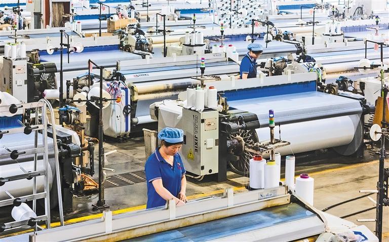 江苏省海安市的南通同春龙纺织科技有限公司车间内,工人在赶制化纤产品订单。
