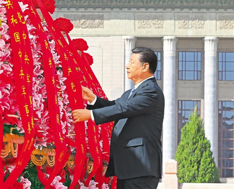 习近平迈步上前,仔细整理花篮缎带。随后,习近平等党和国家领导人缓步绕行,瞻仰人民英雄纪念碑。