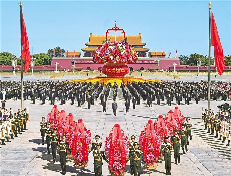 庄严的天安门广场上,鲜艳的五星红旗高高飘扬,人民英雄纪念碑巍然矗立。广场中央,“祝福祖国”巨型花篮表达着对祖国繁荣昌盛的美好祝愿。纪念碑北侧,两组花坛上白菊等鲜花组成的18个花环,寄托着全体中华儿女对英烈的深情追思。