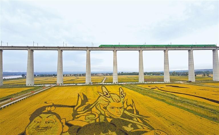 金秋时节,稻香蟹肥,一列列车从内蒙古自治区鄂尔多斯市准格尔旗黄河稻渔生态观光园上方驶过。这里曾是一片盐碱地,当地通过“稻蟹共生”模式,引入循环种养等技术,形成“一水两用、一田双收”的生态良性循环,实现了生态与经济双赢。本报记者 余 健摄
