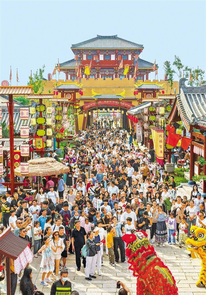 10月1日,山东乐陵影视城景区人气火爆。双节假期,全国多地景区举办形式多样的活动,为游客提供沉浸式体验。贾 鹏摄(中经视觉)