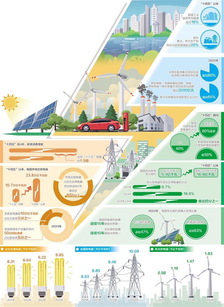 “十四五”时期,我国能源领域改革持续深化,持续推进市场化改革,不断激发能源市场发展动力。能源价格形成机制加快完善,发电侧煤电、新能源全面进入市场;能源市场体系加快建设,基本建成多层次、多品类、多功能的全国统一电力市场体系,中长期和辅助服务市场交易实现全覆盖,现货市场正在全国范围内加快铺开。改革红利加速释放,推动市场活力不断提升。