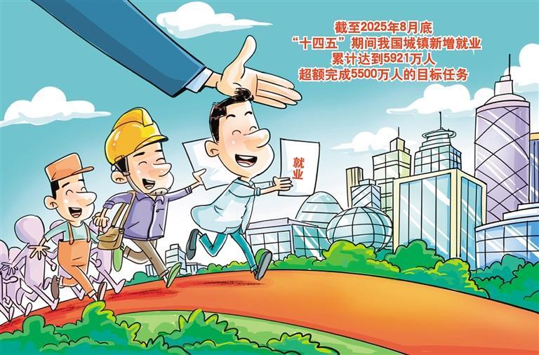 国新办近日举行的“高质量完成‘十四五’规划”系列主题新闻发布会发布消息称,“十四五”期间,我国就业局势总体稳定,就业结构持续优化,就业质量稳步提升。截至8月底,城镇新增就业累计达到5921万人,超额完成5500万人的目标任务;城镇调查失业率前四年均值为5.3%,低于5.5%的预期控制目标。稳就业是民生之本、经济之基,关乎社会稳定、消费增长与高质量发展。为推动人口红利向人才红利转变,接下来,需不断充实就业优先政策体系,注重精准施策分类帮扶,稳定重点群体就业基本盘,拓宽就业渠道。完善失业保险稳岗返还、就业创业补贴等全链条支持体系。此外,还需全方位强化就业服务,继续推动服务资源向基层延伸、向农村覆盖,不断拓宽农民工就业增收之路。(时 锋)