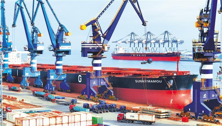 10月4日,货轮在山东港口烟台港装载出口卡车。国庆中秋假期,山东港口烟台港各港区码头一派繁忙,工人们坚守一线,确保港口生产安全有序。唐 克摄(中经视觉)