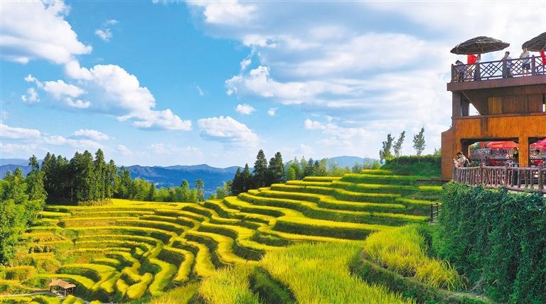 10月7日,湖南省娄底市新化县紫鹊界梯田稻谷成熟,吸引不少游客前来观光游览。