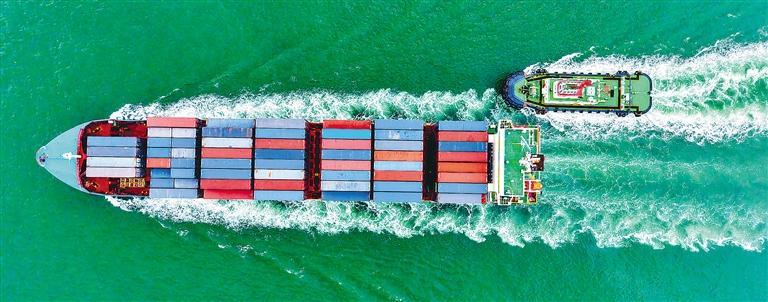 10月7日,山东港口青岛港,一艘装载外贸集装箱的货轮驶入港口。国庆中秋长假期间,全港一片繁忙,全力保障物流大动脉畅通。 俞方平摄 (中经视觉)