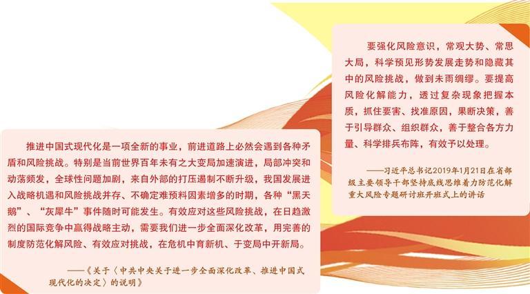 当前全球经济充满不确定性,也充满风险。如何防范化解重大经济风险,是一个重要课题。党的十八大以来,习近平总书记告诫全党要树立底线思维,用“木桶原理”警示全党既要善于补齐短板,更要注重加固底板。习近平总书记指出,“面对复杂多变的国际形势和艰巨繁重的国内改革发展稳定任务,我们一定要居安思危,增强忧患意识、风险意识、责任意识”“各种风险我们都要防控,但重点要防控那些可能迟滞或中断中华民族伟大复兴进程的全局性风险”。我们要深刻理解习近平总书记对防范化解风险提出的重要要求,坚持战略思维和系统思维,提高科学预见能力,辨识各类风险挑战,在大变局中赢得发展主动。