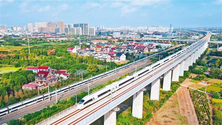 10月10日,动车组列车行驶在江苏省如皋市境内。11日起,全国铁路实行新的列车运行图,安排图定旅客列车超1.3万列,货物列车超2.3万列,铁路客货运输能力、服务品质和运行效率将进一步提升。吴树建摄(中经视觉)