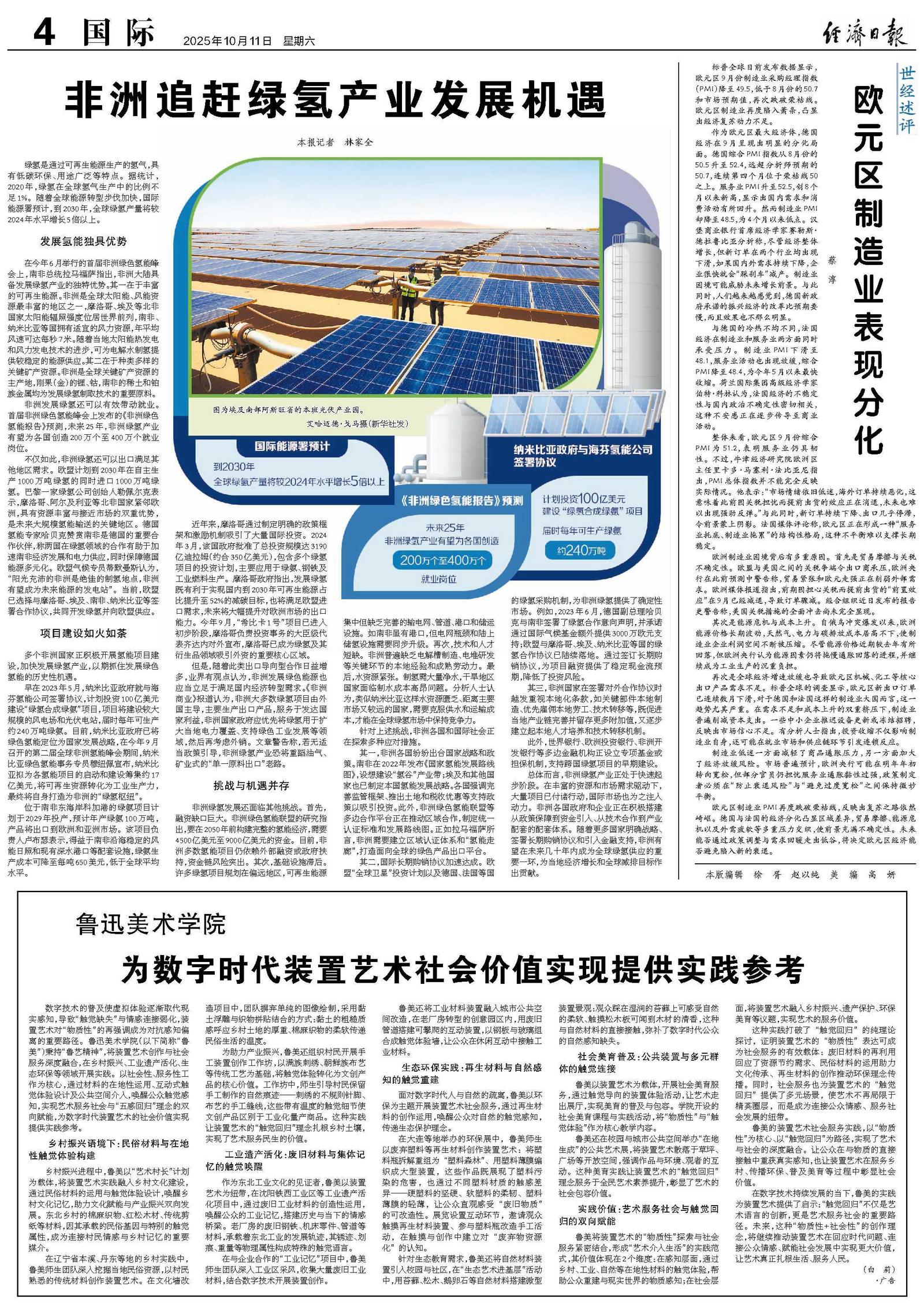 不仅如此,非洲绿氢还可以出口满足其他地区需求。欧盟计划到2030年在自主生产1000万吨绿氢的同时进口1000万吨绿氢。巴黎一家绿氢公司创始人勒佩尔克表示,摩洛哥、阿尔及利亚等北非国家紧邻欧洲,具有资源丰富与接近市场的双重优势,是未来大规模氢能输送的关键地区。德国氢能专家哈贝克赞赏南非是德国的重要合作伙伴,称两国在绿氢领域的合作有助于加速南非经济发展和电力供应,同时保障德国能源多元化。欧盟气候专员蒂默曼斯认为,“阳光充沛的非洲是绝佳的制氢地点,非洲有望成为未来能源的发电站”。当前,欧盟已选择与摩洛哥、埃及、南非、纳米比亚等签署合作协议,共同开发绿氢并向欧盟供应。