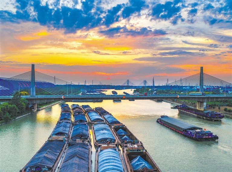 日前,在江苏省淮安市,京杭运河淮安段的集装箱港口和航道一派繁忙景象。近年来,通过京杭运河运输的大宗货物及集装箱占比逐年提高,为沿岸区域经济发展注入动力。