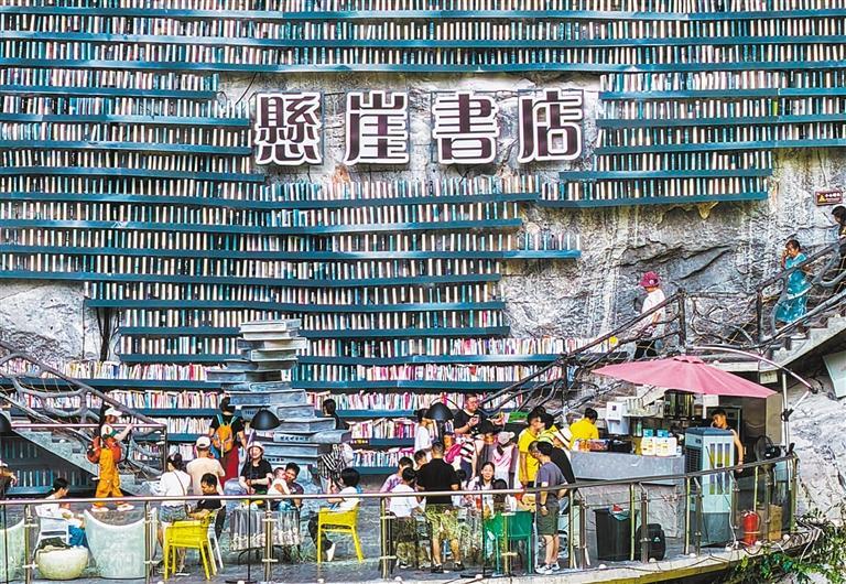 10月2日,位于广西壮族自治区河池市罗城仫佬族自治县棉花天坑景区内的悬崖书店吸引了众多游客。