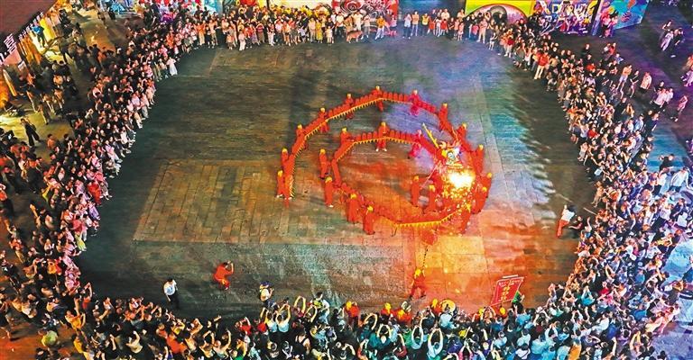 10月5日,安徽省芜湖市镜湖区芜湖古城,游客在观赏国家级非遗徽州板凳龙巡游展演。