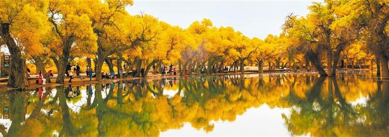 10月10日,游客在内蒙古额济纳旗大漠胡杨林景区游玩。额济纳旗境内现有天然胡杨林约44万亩,是世界仅存的三大胡杨林之一。 王稳锁摄 (中经视觉)