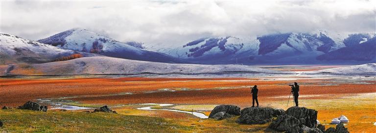 10月2日,新疆阿勒泰市托勒海特草原,雪山、河流、云海相映成景。 阿尔达克·拜斯汗摄(中经视觉)