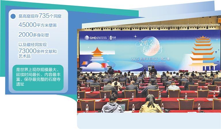 “当前,我们以更加开放的胸襟搭建起全球对话的舞台。”朱建军介绍,自2016年起,丝绸之路(敦煌)国际文化博览会已举办8届,吸引来自130多个国家和地区的6000余名政要、学者、企业家共襄盛举。敦煌成功举办“第四届文明交流互鉴对话会”“2025中国会展敦煌行”等各类会议展览、节庆赛事,向各地展示“敦煌风采”。同时,敦煌先后与6个国家8个城市缔结为国际友好城市关系,入选“东亚文化之都”;连续3年举办“敦煌文化环球连线”系列活动,与30多个国家建立线上文化交流机制,向国内外不同受众讲述“敦煌故事”。