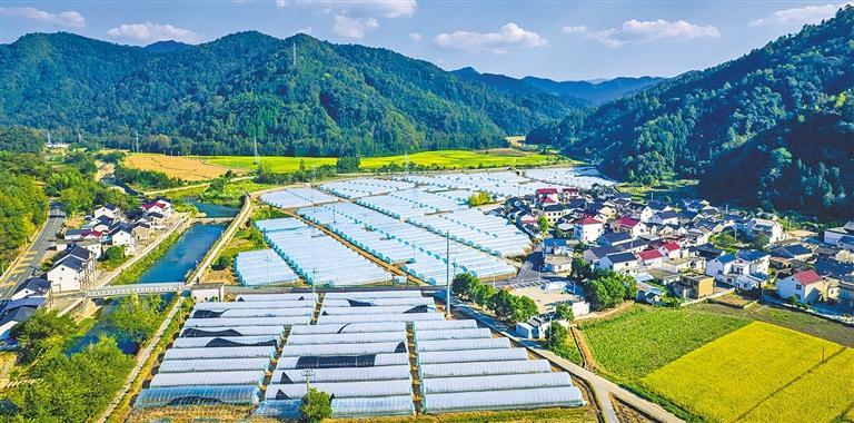 日前,安徽省池州市石台县横渡镇琏溪村,金色的稻田与羊肚菌大棚、民居等交相辉映,绘就一幅美丽乡村田园丰收画卷。李智宏摄(中经视觉)